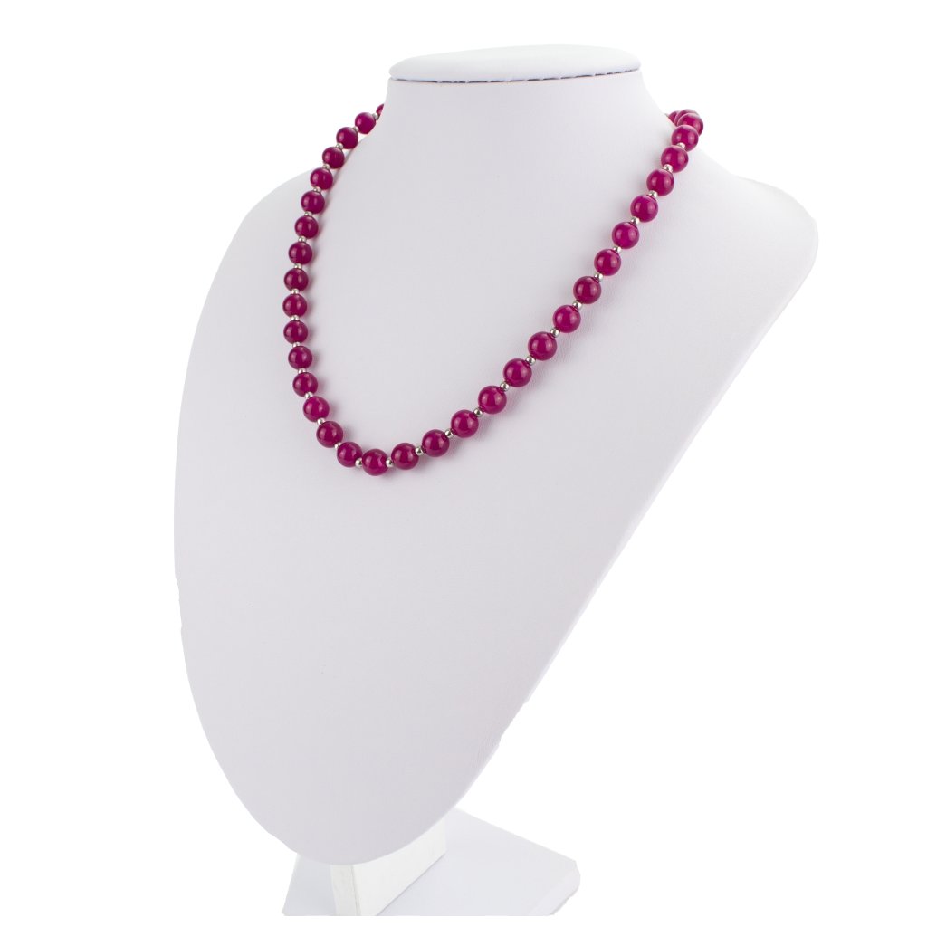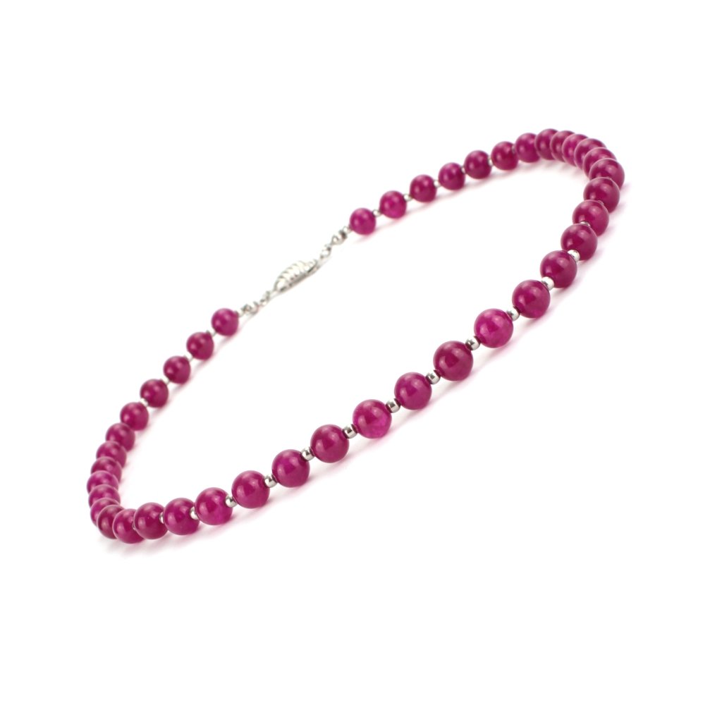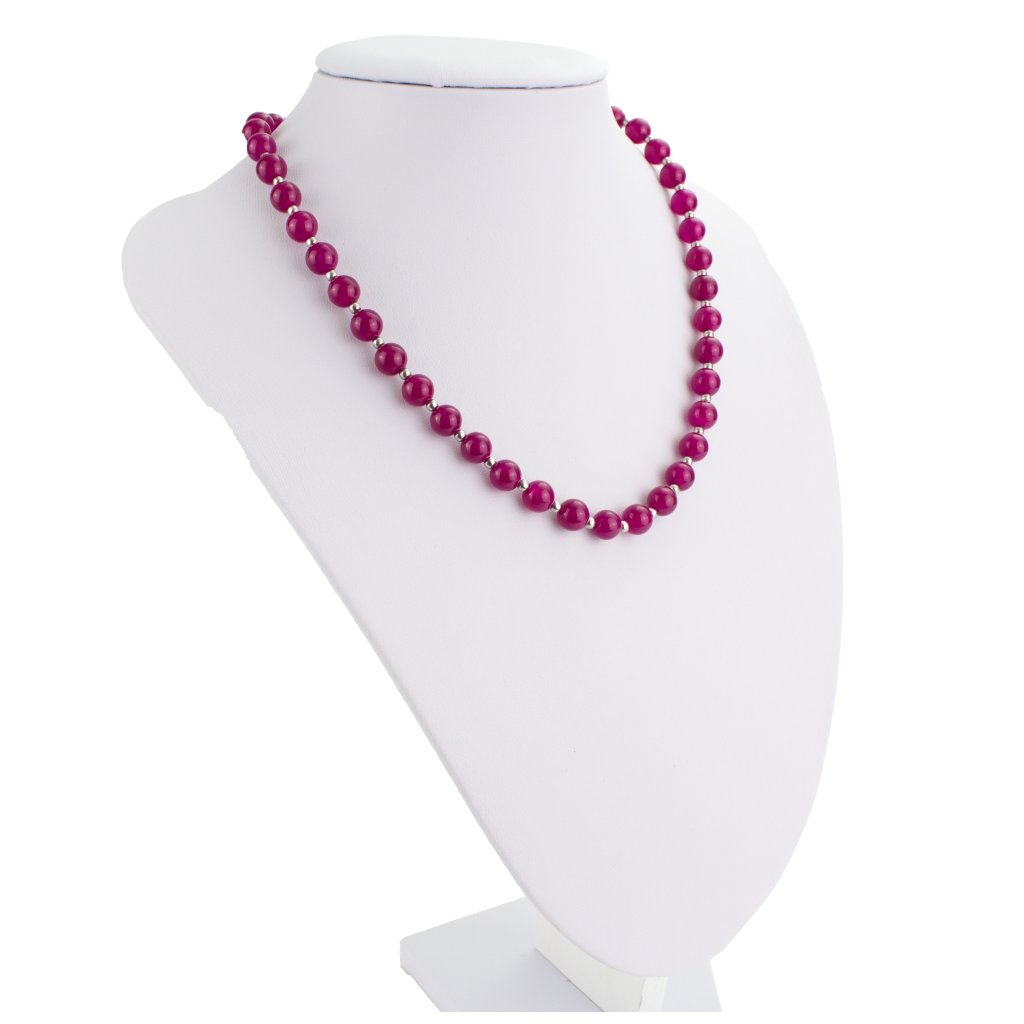 Výrazný náhrdelník z prírodného malajského polodrahokamu jadeitu v nádhernej farbe lesného ovocia. Luxusný náhrdelník značky ALEXIS MARTEN z korálkov oválneho tvaru, kombinovaných s korálkami z chirurgickej ocele. Bezpečnostné zapínanie z chirurgickej ocele chráni náhrdelník pred stratou. Návlek na špeciálnej niti zo 100% prírodného hodvábu. Náhrdelník je vhodný na každodenné nosenie do práce, ale nádherný bude aj k spoločenským šatám. Unikátna černicová farba vynikajúco vyzdvihne akýkoľvek outfit. Náhrdelník je dofarbovaný, jeho použitie v oblasti meditácie a liečiteľstva konzultujte s odborníkom z tejto oblasti. Takýto náhrdelník je skvelý darček a každé ženské srdce zažiari. A nakoľko všetky kovové časti sú z kvalitnej chirurgickej ocele (žiadna lacná bižutéria)tak šperk Vám vydrží veľmi dlho.