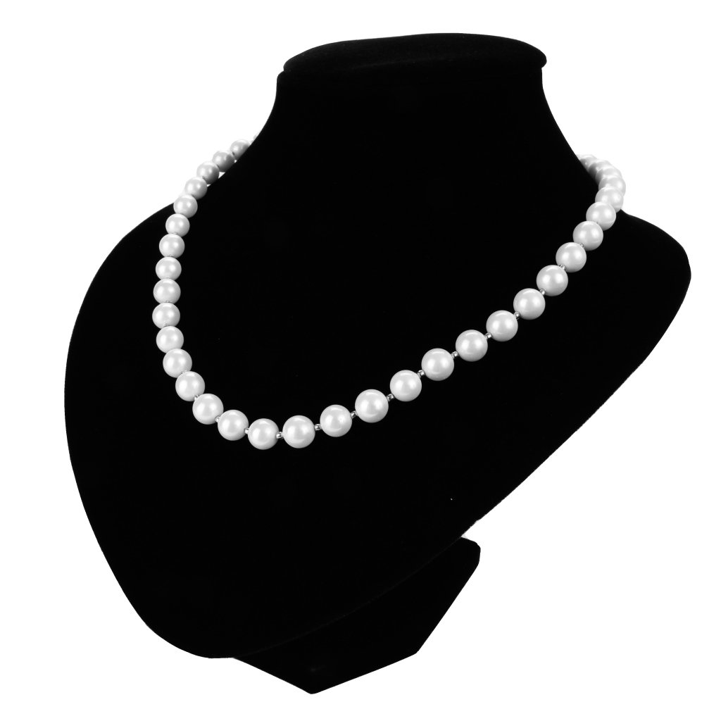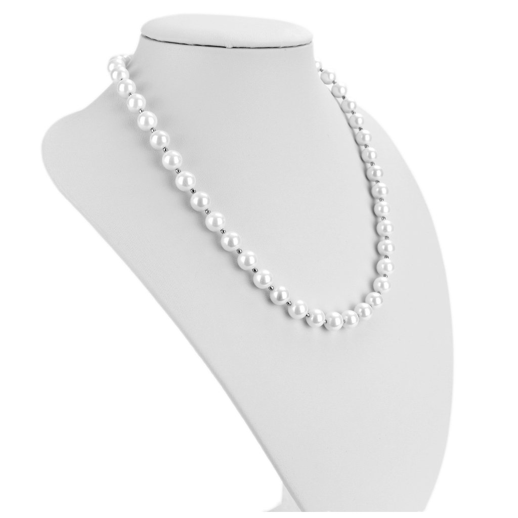 Elegantný perlový náhrdelník značky ALEXIS MARTEN z perál bielej farby jednoradový. Je to klasický jednoradový perlový náhrdelník vyrobený so shell perál. Medzi perlami su guličky z striebornej farbe z vyskokvalitnej chirugickej ocele. Tieto guličky z chirurgickej ocele dodajú šperku krásny strieborný efetk a zároveň zabranujú prelám, aby sa o seba dotíkali . Perly sú navlečené na špeciálnej niti zo 100% prírodného hodvábu, odolnej voči pretrhnutiu. Priemer perál je 8 mm. Ozdobné bezpečnostně zapínanie z chirurgickej ocele. Tento krasný nahrdelník sa svojou dlžkou hodí ku všetkym tipom výstrihov a je určený pre všetky vekové skupiny.