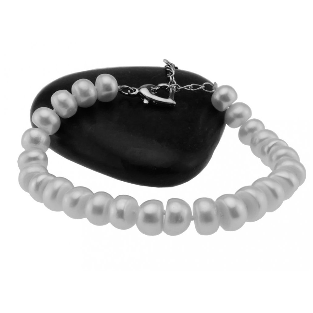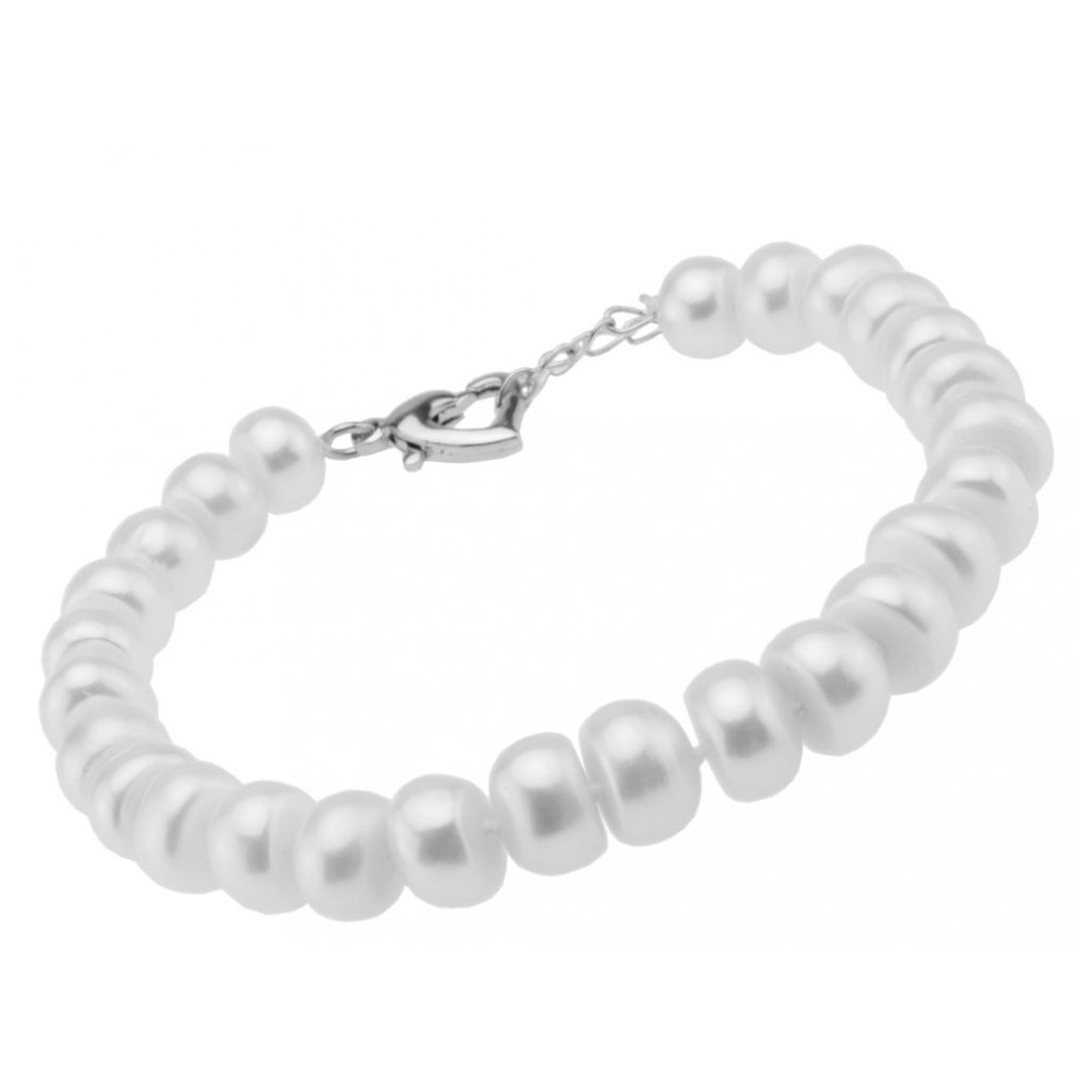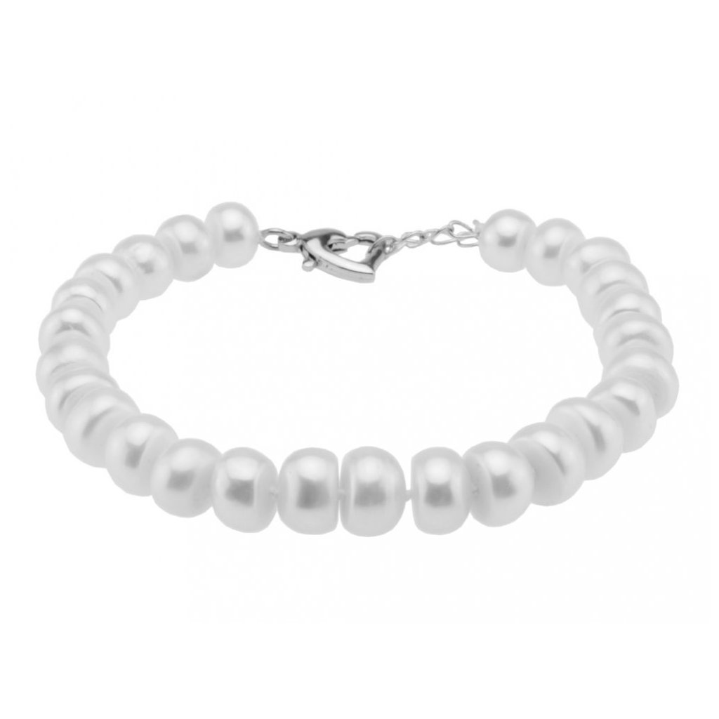 Elegantný dámsky náramok vyrobený z riečnych perál. Krásne elegantné biele perly sú veľmi obľúbeným dámskym šperkom či už ako náramok, náušnice, alebo náhrdelník. Riečne perly majú nepravidelný tvar, čo ich robí ešte výnimočnejšími. Náramok má zapínanie na klasickú karabínku, ktorá je v tvare srdiečka a disponuje s predĺžovacou retiazkou. Perly sú navlečené na 100% prírodnej hodvábnej niti, ktorá je odolná voči pretrhnutiu.