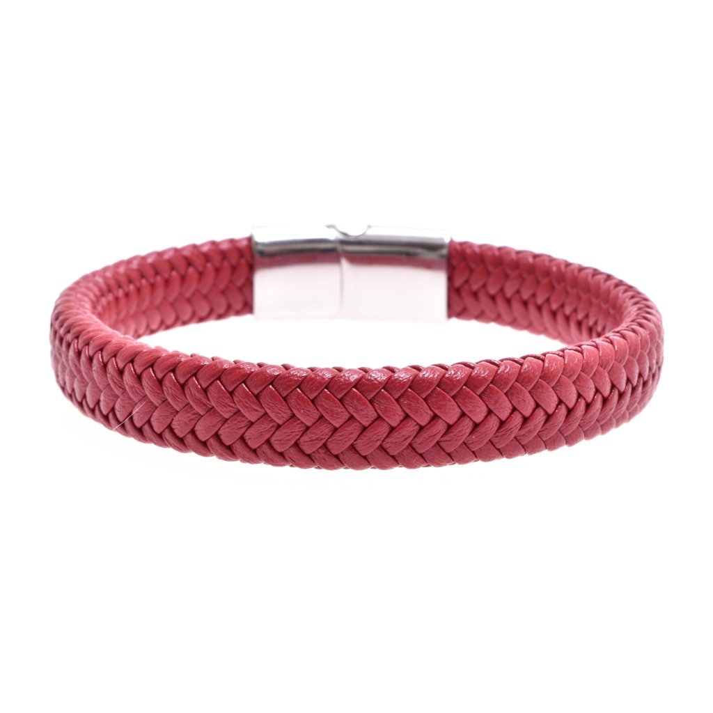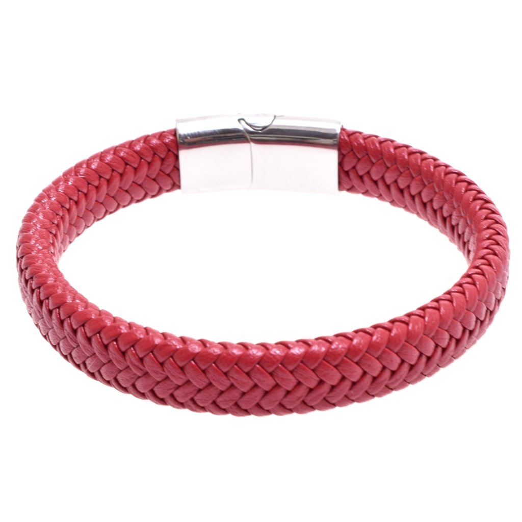 Krásny unisex náramok červenej farby z eko kože. Náramok má pekný pletený vzor, je trochu hrubší no i tak pekne vynikne na dámskej i pánskej ruke. Tento šperk slúži aj ako ochrana proti urieknutiu, no poslúži aj ako krásny módny doplnok. V súčasnosti sú náramky proti urieknutiu veľmi populárne aj keď mnoho ľudí ich nevyhľadáva kvôli tejto funkcii, ale kvôli tomu, že sa dobre dajú zladiť s inými šperkami a oživia každý outfit. Zapínanie náramku je vyrobené z chirurgickej ocele.