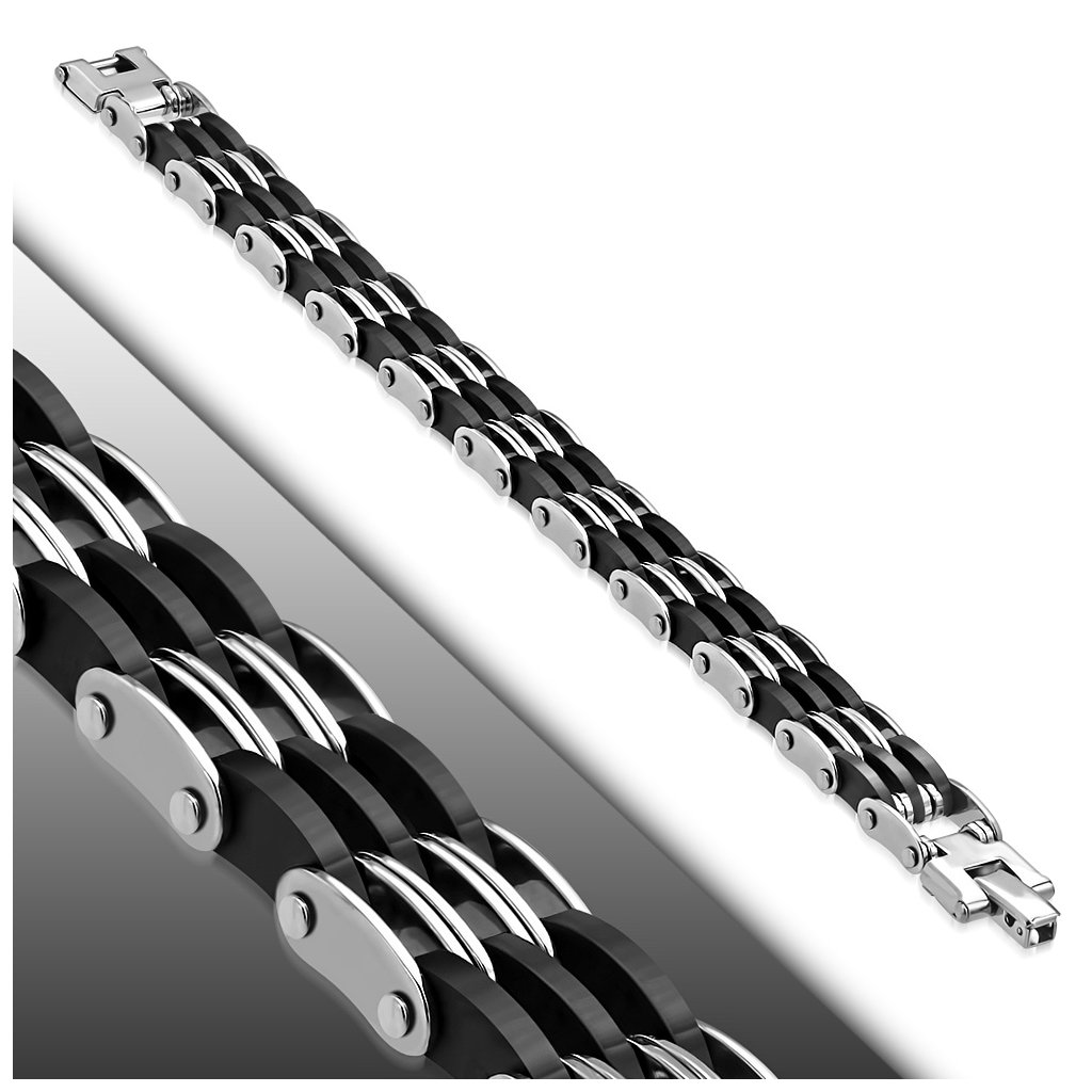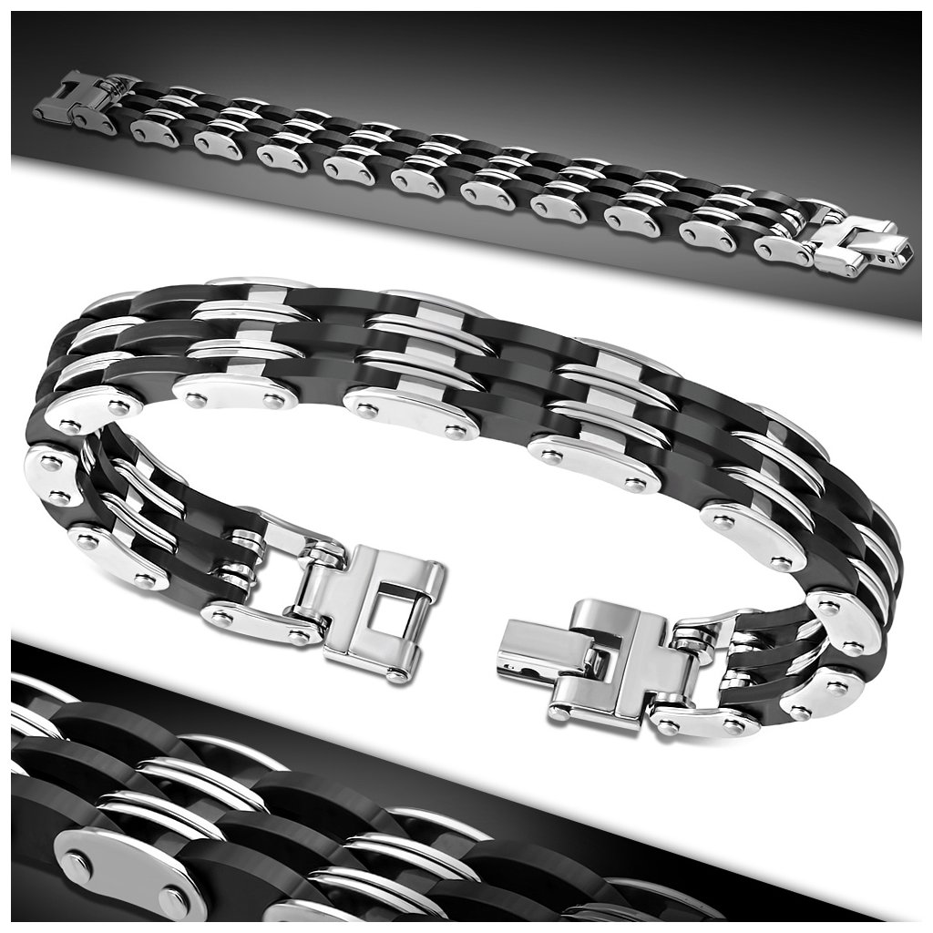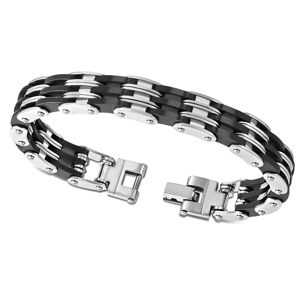 Moderný hrubý pánsky náramok z chirurgickej ocele v kombinácii striebornej a čiernej farby. Hrubé pánske moderné náramky sú u pánov veľmi obľúbené zvlášť. Tento náramok je určený pre všetky vekové kategórie.