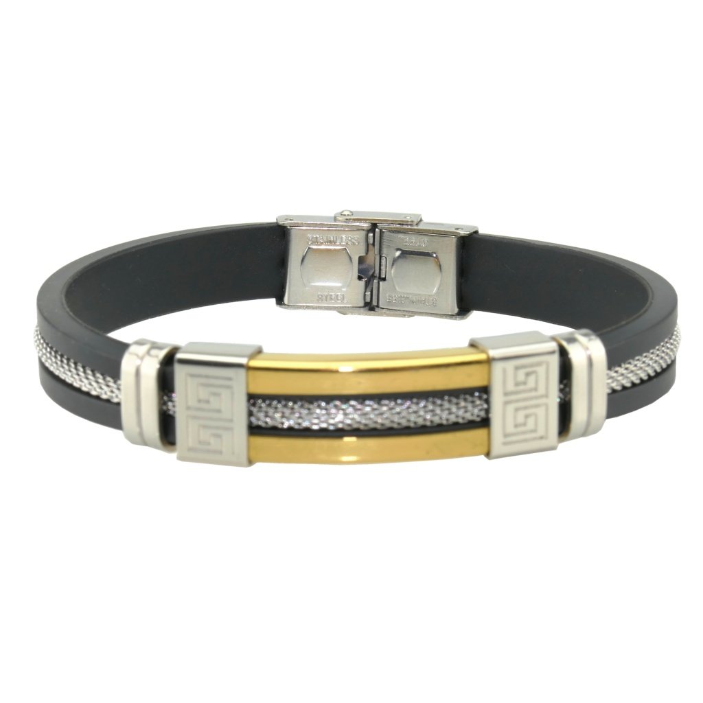 Krásny pánsky náramok z chirurgickej ocele a silikónu. Náramok je vyrobený zo silikónu, v strede ktorého je vložená platnička z chirurgickej ocele. Náramok je zdobený ozdobami z chirurgickej ocele v striebornej a zlatej farbe. V tejto kombinácií vyzerá veľmi zaujímavo a je skvelým kúsok, ktorý by nemal chýbať žiadnemu mužovi. Chirurgická oceľ, z ktorej sú vyrobené ozdoby a zapínanie, je odolná, pevná a nestráca lesk.