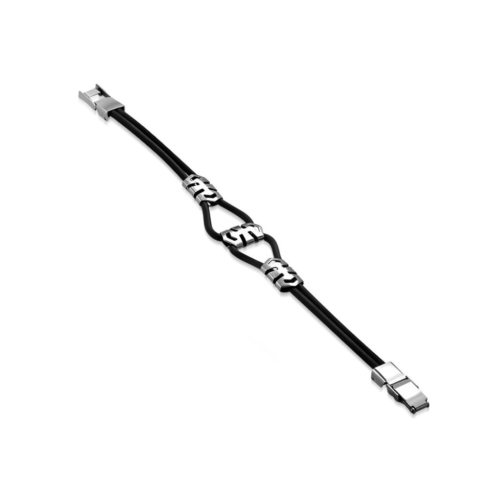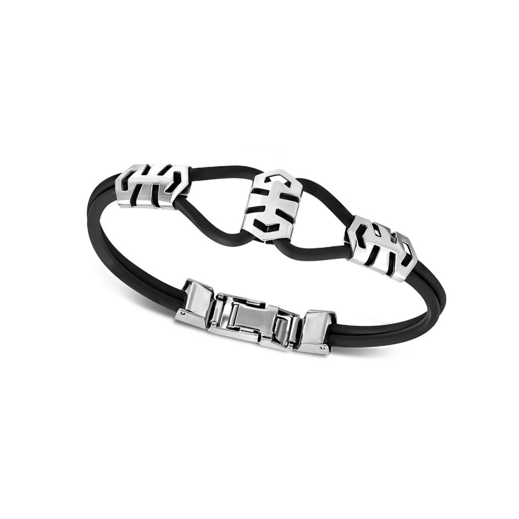 Pánsky náramok vyrobený zo silikónovej gumy v kombinácií s chirurgickou oceľou. Náramok pozostáva z dvoch tenších náramkov, ktoré sú spojené do jedného vďaka ozdobným trom platničkám, ktoré sú vyrobené z ocele. Celý náramok pôsobí modernom dojmom a ľahko si ním každý pán doplní svoj outfit. Hodí sa k športovému i ležérnejšiemu štýlu. Chirurgická oceľ je materiál, ktorý nekoroduje ani nečerná a nevyžaduje si žiadnu špeciálnu starostlivosť. Náramok má zapínanie hodinkového typu.