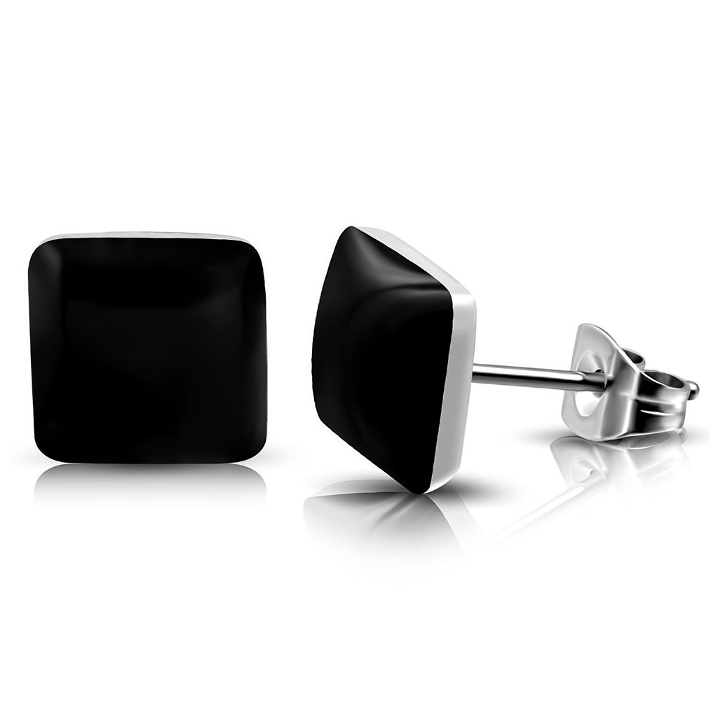Napichovacie náušnice z chirurgickej ocele s plochým čiernym hranatým lôžkom. Výplň lôžka je hladká, s prirodzeným leskom. Hrana lôžka je 7 mm. Vysoko aktuálne štýlové unisex náušnice, vhodné pre dámy aj pre pánov. Univerzálny model z chirurgickej ocele bez alergických reakcií.