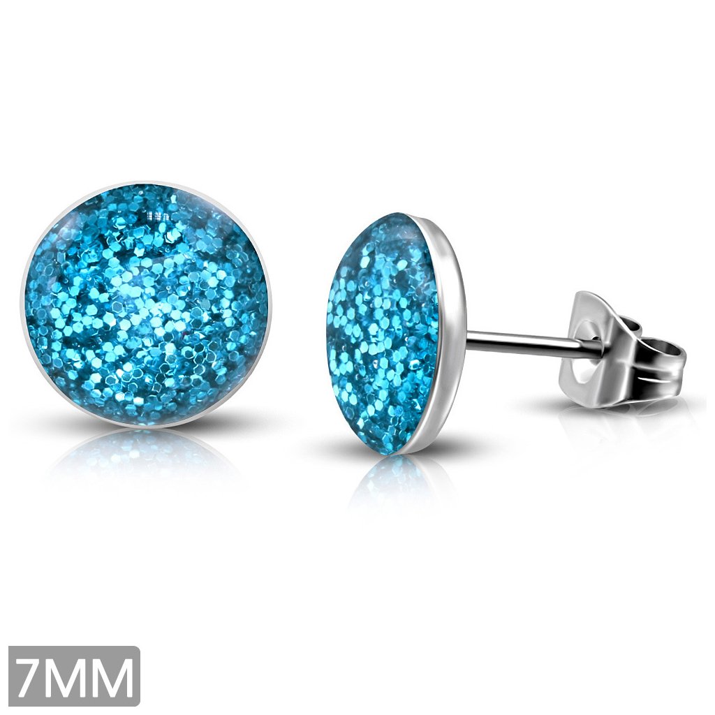 Náušnice z chirurgickej ocele s plochým modrým lôžkom s glitrami. Glitre vytvárajú zaujímavý trblietavý efekt a lesk. Priemer lôžka je 7 mm. Pôvabné, dobre kombinovateľné náušnice z chirurgickej ocele bez alergických reakcií čo pri šperku je v dnešnej dobe dôležitá vlastnosť. Okrem toho oceľové šperky nemenia farbu, a nekorodujú čo zaručuje týmto náušniciam oveľa dĺhšiu trvácnosť ako pri iných materiáloch, ako je striebro či bižutéria.