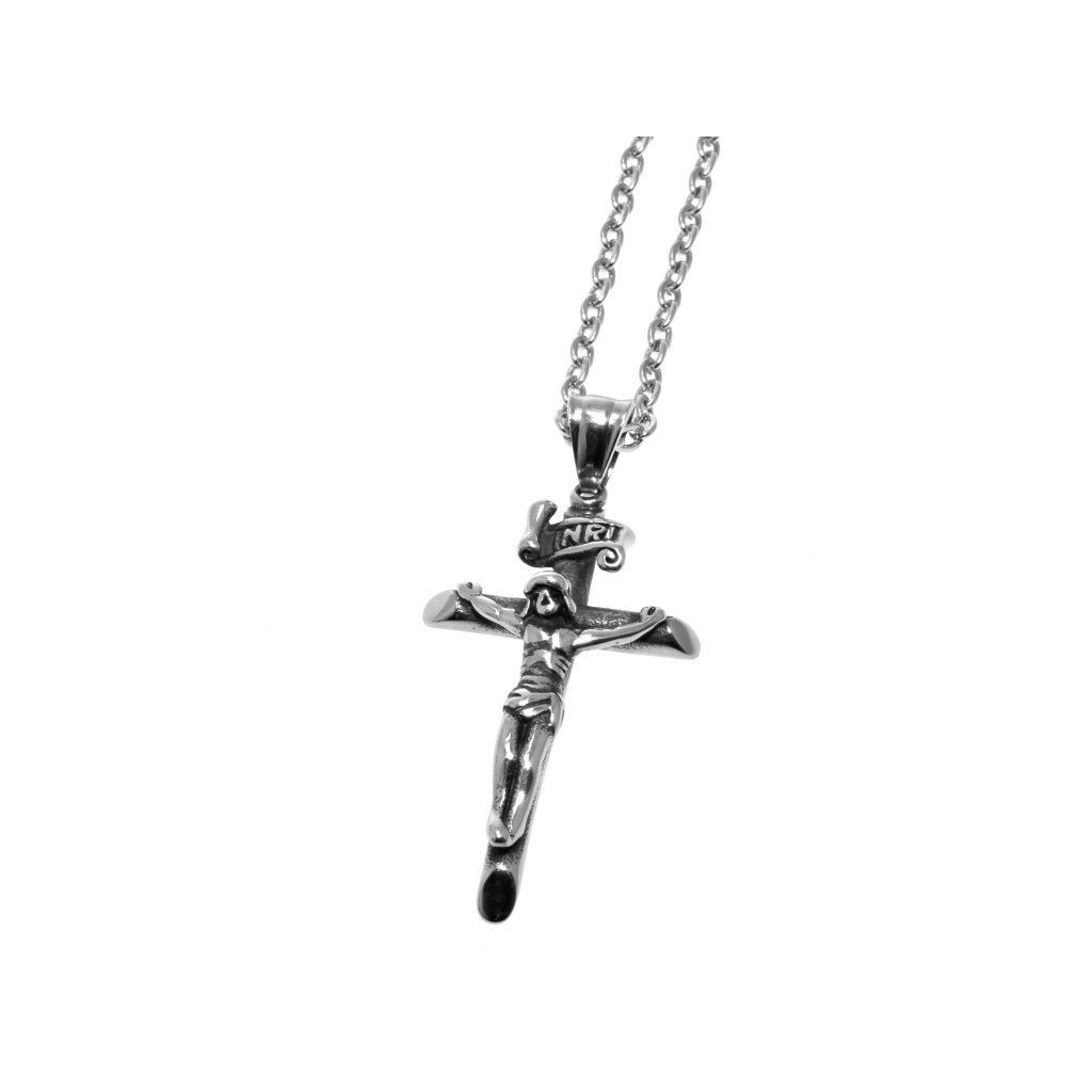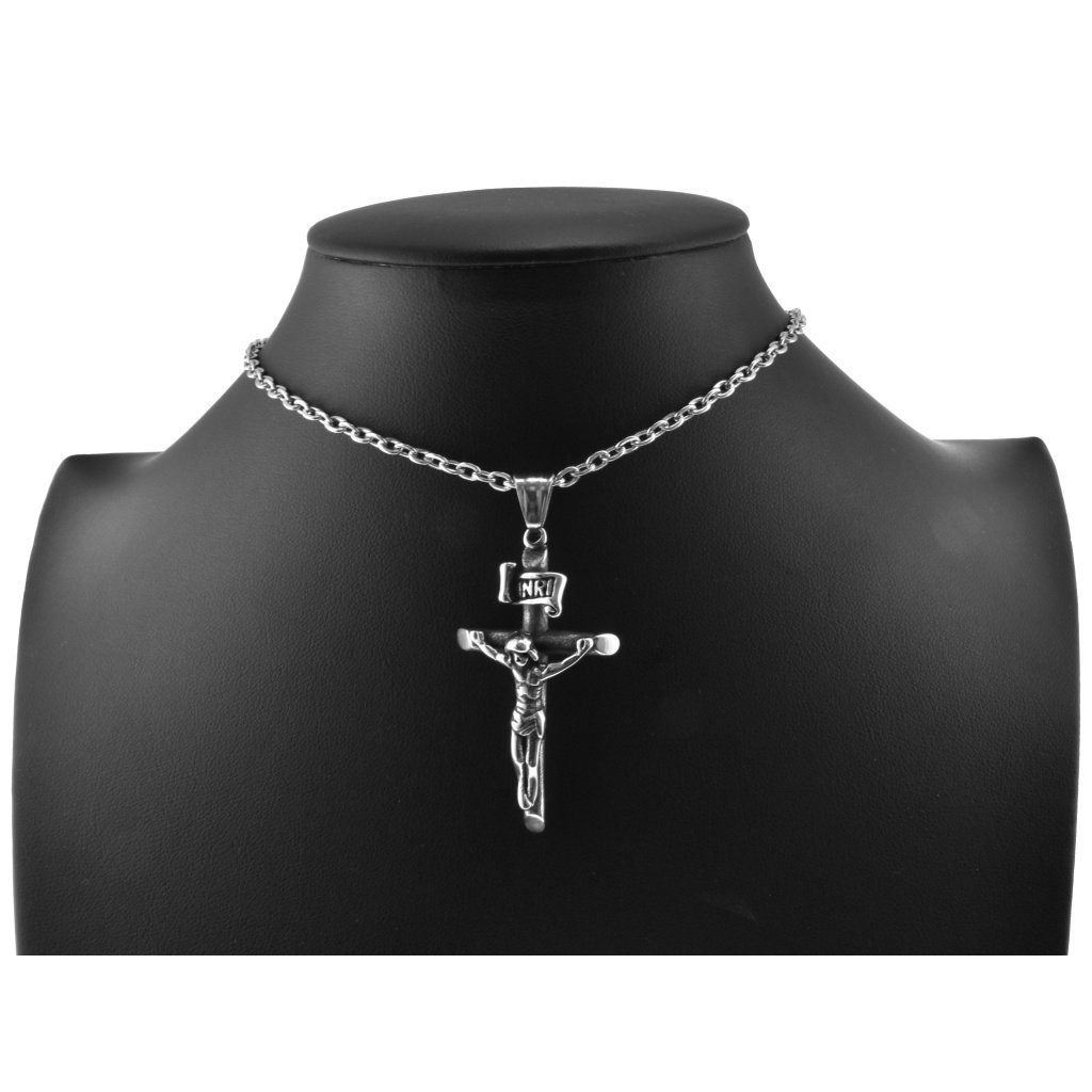 Retiazka so zaujímavým príveskom vyrobená z chirurgickej ocele. Prívesok má tvar kríža, ktorý je potiahnutý tmavou patinou a je na ňom zobrazený ukrižovaný Ježiš Kristus. Nad ním je nápis INRI, čo znamená Ježiš Kristus, kráľ Židov. Tento prívesok má výraznú náboženskú hodnotu a svojim moderným prevedením tak dokáže osloviť aj dámy aj pánov. Materiál retiazky aj prívesku je kvalitná chirurgická oceľ, vďaka ktorej má Váš šperk zaručenú dlhú živostnosť. Šperky z chirurgickej ocele nekorodujú, neoxidujú a sú vhodné na každodenné nosenie, pretože sú antialergické. Pri tomto produkte si viete vybrať dĺžku retiazky ak Vám nevyhovuje jej základná dĺžka.