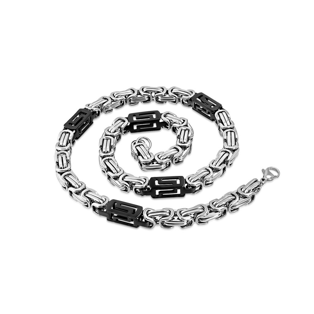 Hrubšia pánska retiazka z chirurgickej ocele v striebornom prevedení. Retiazka má kráľovský vzor, ktorý je medzi pánmi veľmi populárny a často vyhľadávaný. Dominantou šperku je grécky vzor v čiernej farbe, ktorý vôbec nepôsobí rušivo, skôr naopak, pretože tým zvýrazňuje jeho jedinečnosť. Retiazka je vhodná pre pánov v každej vekovej kategórií a výborne sa dá zladiť napríklad s náramkom s kráľovským vzorom. Materiál retiazky je kvalitná chirurgická oceľ. Tá je pevná a odolná, nestráca svoj lesk, pretože nekoroduje a nehrdzavie. Je vhodná na bežné každodenné nosenie. Zapísanie retiazky je na klasickú karabínku.