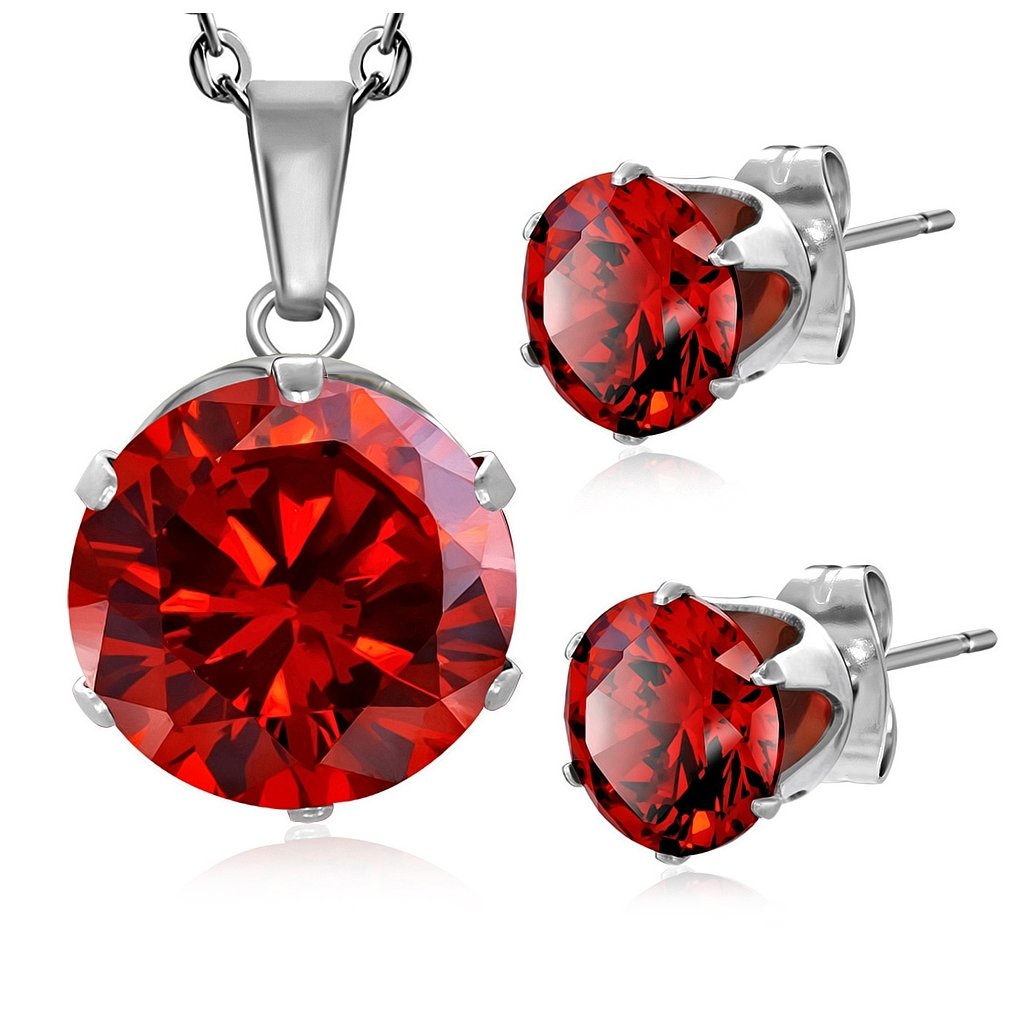 Retiazka s príveskom a s náušnicami z chirurgickej ocele s okom červenej farby z kubického zirkónu -SET